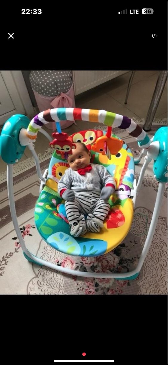 Canlı renklerde, yumuşak dolgulu oturma alanı ve eğlenceli asılı oyuncaklarla bebekler için rahat ve eğlenceli bir salıncak.