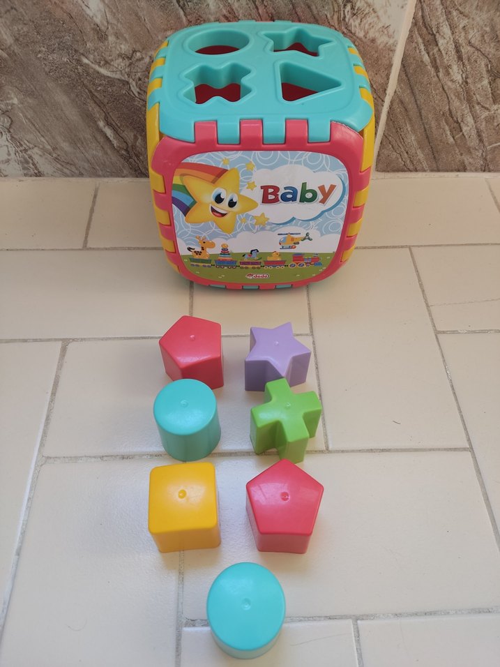 Çeşitli şekillerde bloklar ve eşleştirme kutusu içeren renkli bebek eğitim oyuncağı. Öğrenmeyi ve motor becerileri geliştirir.