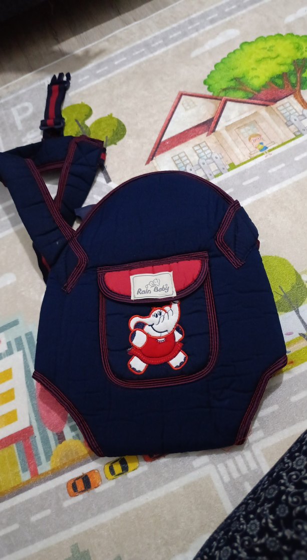 Ayarlanabilir kayışlara sahip renkli bebek taşıyıcı, ön cebinde eğlenceli fil desenli. Yumuşak ve rahat kumaştan üretilmiştir.