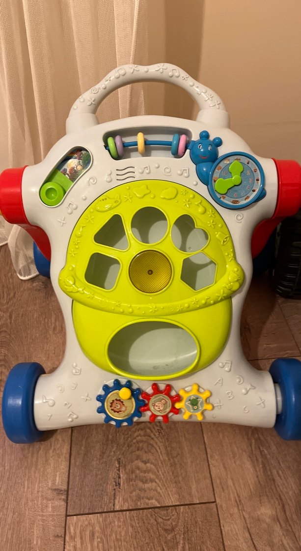 Motor becerilerini geliştiren oyuncaklar ve şekil ayırıcı içeren renkli bebek yürüteci. Kolay hareket için tekerlekli, çok renkli tasarım.