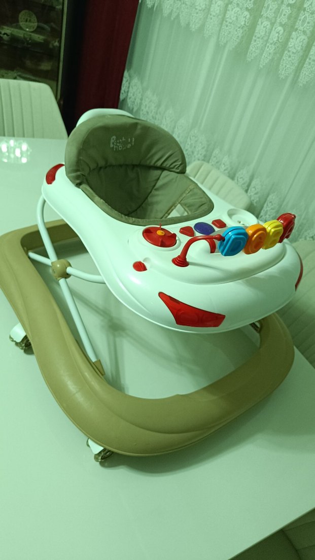 Renkli oyuncaklara ve rahat oturma alanına sahip bebek yürüteci. İlk adımlar için destek sağlar.