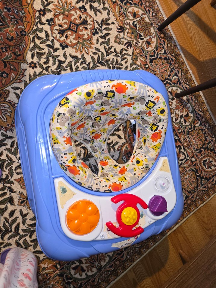 Mavi çerçeveli ve desenli renkli oturma kısmına sahip bebek yürüteci. Ön tepside eğlenceli oyuncaklar bulunur.