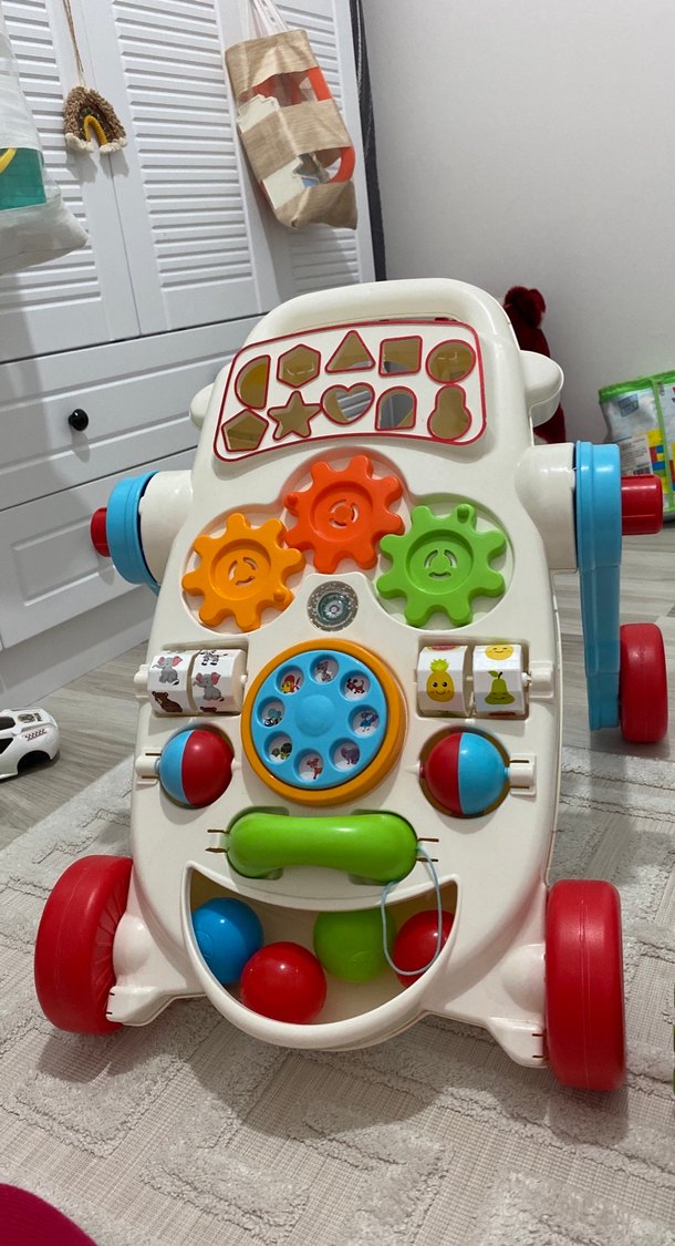 Renkli bebek yürüteci, dişliler, şekil eşleştirme, toplar ve dönen parçalarla dolu, erken yürümeyi destekler.