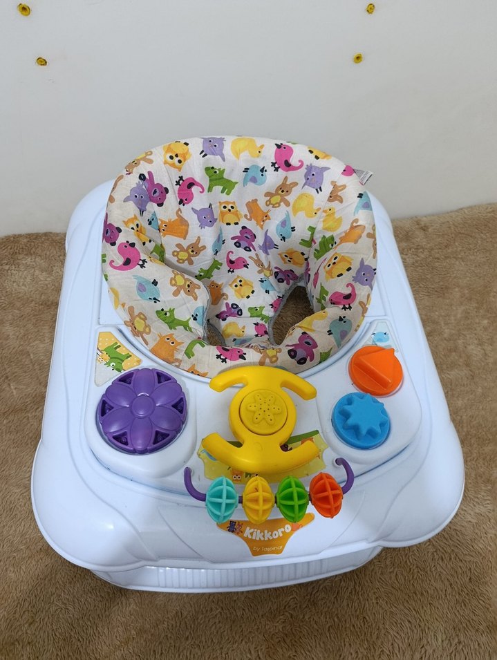 Yumuşak hayvan desenli oturağı ve etkileşimli oyuncakları olan renkli bebek yürüteci.