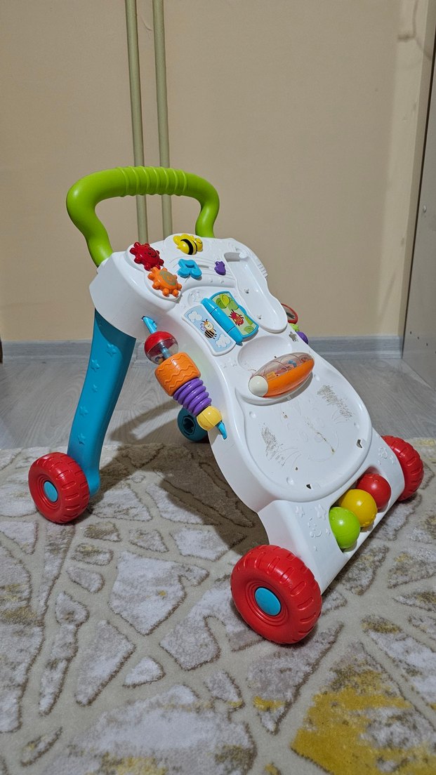Renkli, oyuncaklı bebek yürüteci, sağlam tekerleklerle erken yürümeyi destekler. Çok renkli tasarımı görsel uyarımı artırır.