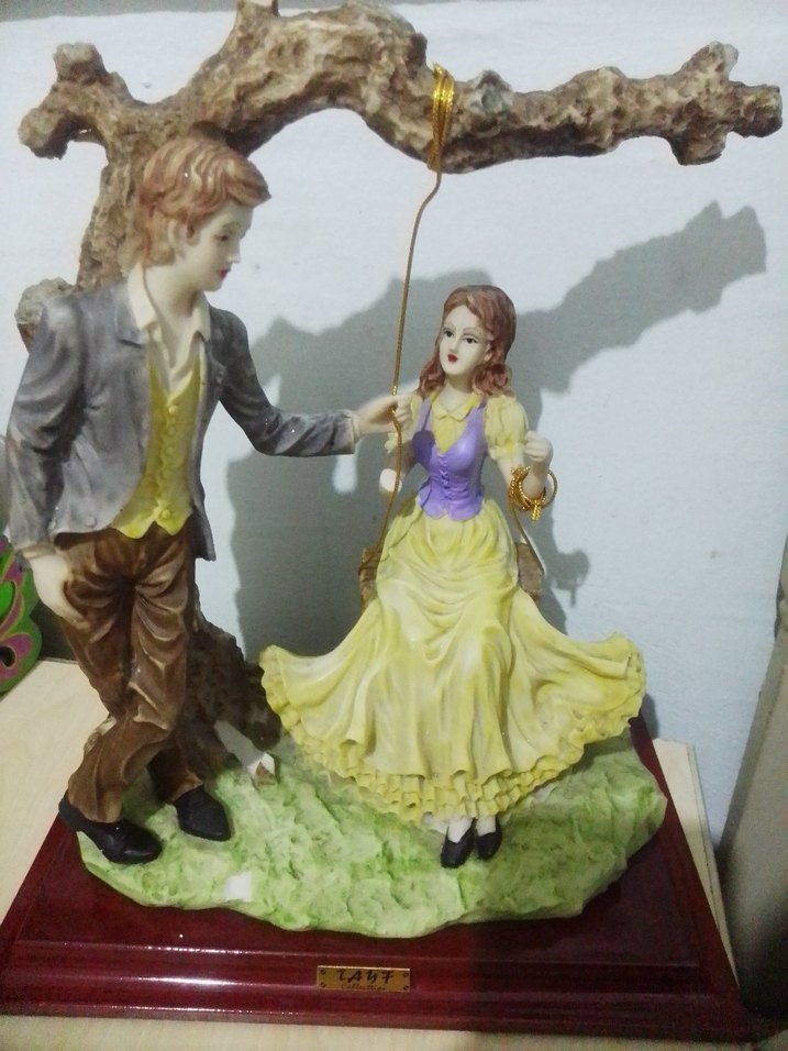 Renkli çift figürini, sarı elbiseli kadın ve gri ceketli adam, ağaç altında. Ahşap taban ve yeşil çim detayıyla tamamlanmıştır. resimdeki işaretli yerlerinden başka bir sorunu yok