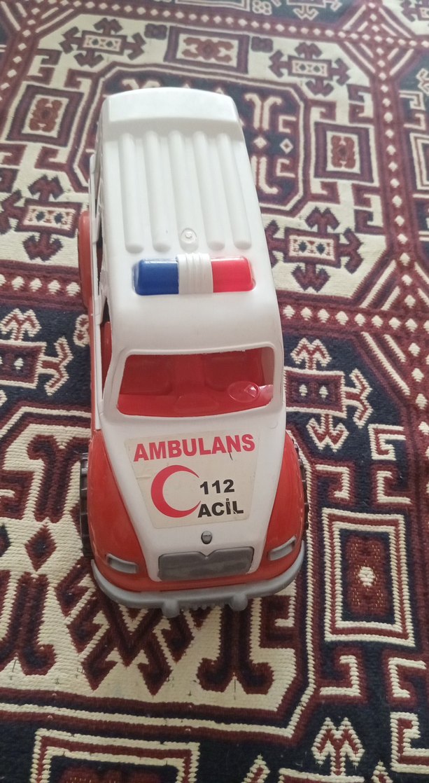 Acil ışıkları ve yazıları bulunan renkli beyaz ambulans oyuncak araba, hayal gücünü destekler.