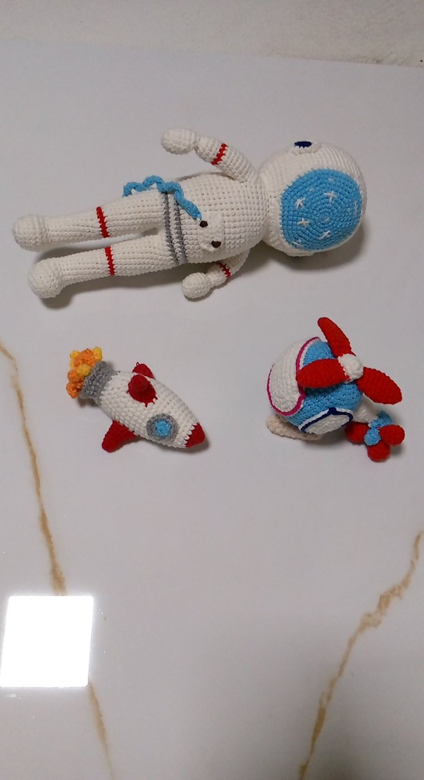 Yumuşak iplikle örülmüş renkli beyaz amigurumi astronot, roket ve pervaneli uçak oyuncak seti.
