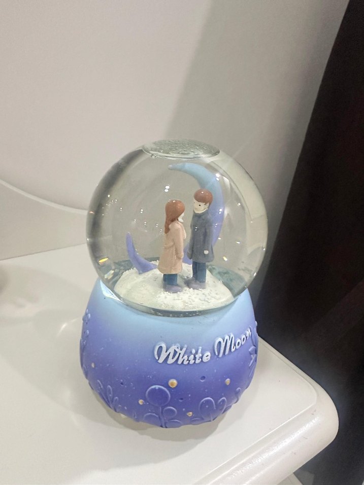 İçinde iki figür bulunan, beyaz kar tabanlı ve "White Moon" yazılı mor-mavi tabanlı renkli kar küresi. ❄️