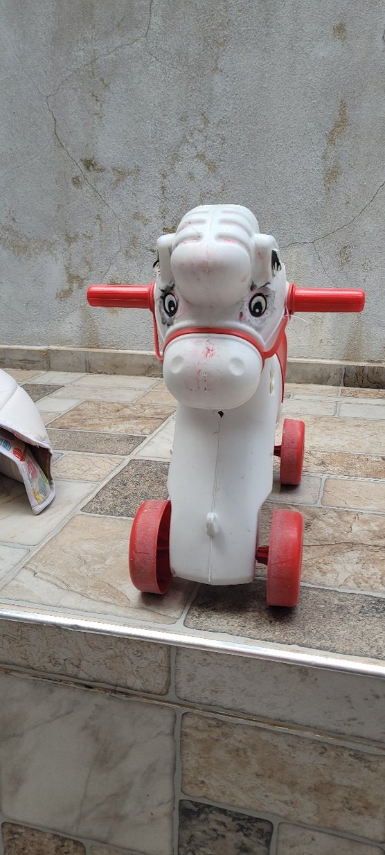 Kırmızı tutma yerleri ve tekerlekleri olan beyaz, at şeklinde renkli çocuk atı