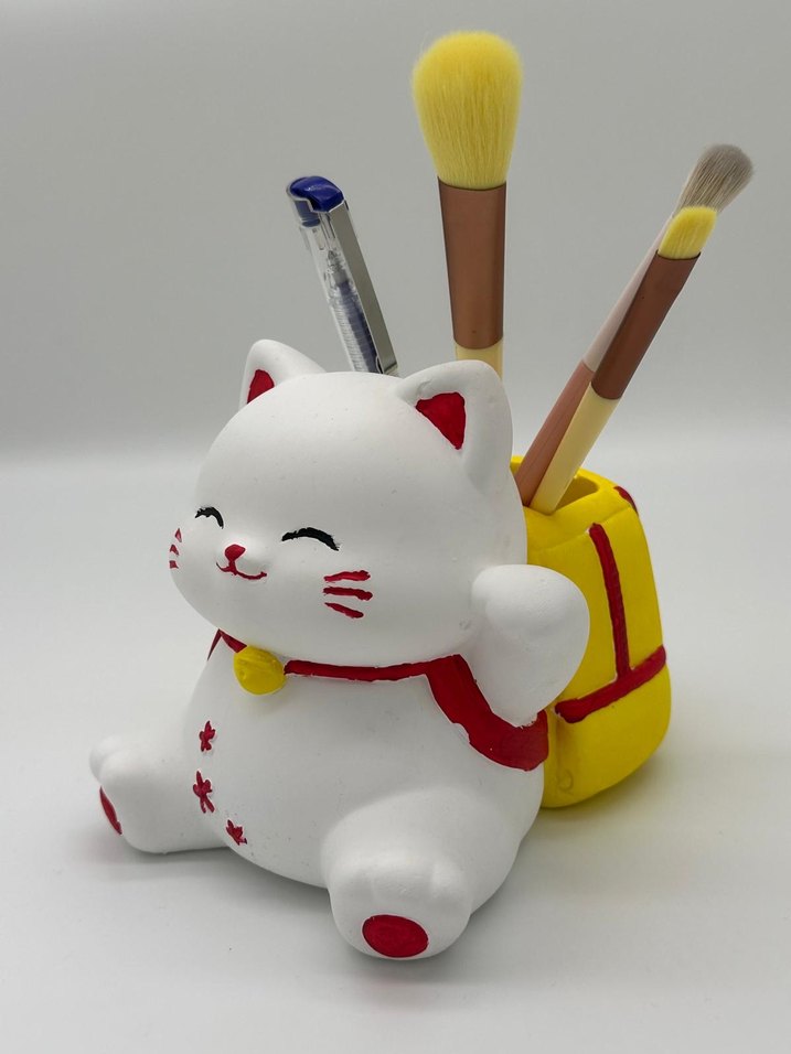 Neşeli tasarıma sahip renkli beyaz kedi şeklinde kalemlik, kalem ve fırçaları düzenlemek için uygun.