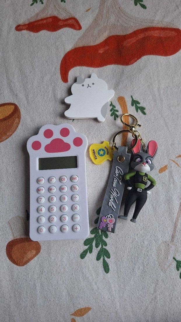 Renkli beyaz kedi temalı hesap makinesi, pembe pati düğmeleri ve sevimli kedi figürlü anahtarlık içerir.