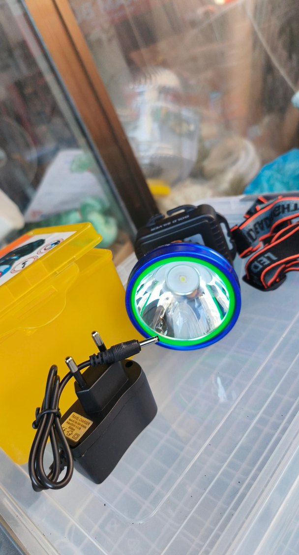 Renkli mavi LED kafa lambası, ayarlanabilir bant ve şarj cihazı ile birlikte gelir. Sarı taşıma kutusu dahildir.