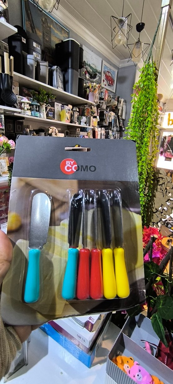 Mavi, kırmızı ve sarı saplı, koyu renk bıçaklardan oluşan 5 parçalık set. Çeşitli kesme işleri için uygundur. sıfır ürün çikolata ve reçel sunum bicaklari