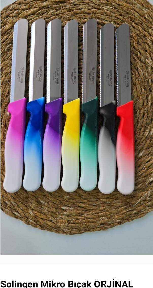 Renkli saplara sahip, her biri paslanmaz çelik bıçaklı bıçak seti. Mutfakta kullanıma uygun. Solingen adet fiyatı