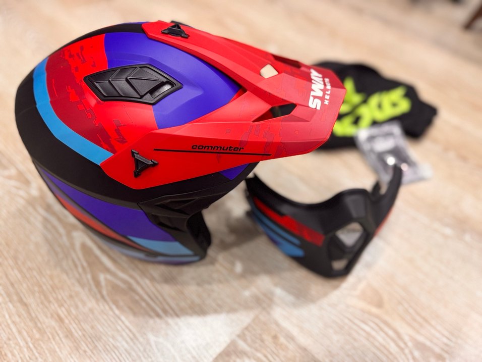 Renkli baskılı tasarıma sahip bu biker motosiklet kaskı dayanıklı kauçuktan üretilmiştir ve Velcro kayış içerir. 'commuter' yazısı bulunur. En fazla 10 kez kullanılmıştır sıfır konumunda gayet temiz titizlilikle kullanıldı motorumu sattıgım için kullanmıyorum . Sway marka gözlüklü , rüzgarlıklı , kılıflıdır .