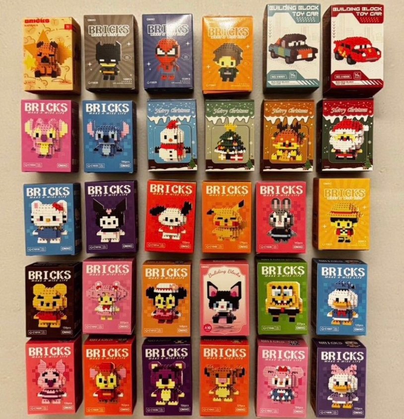 Çeşitli karakterler ve temalar içeren renkli blok oyuncak setleri. Kutularda küçük tuğlalardan yapılmış piksel tarzı figürler yer alıyor.
