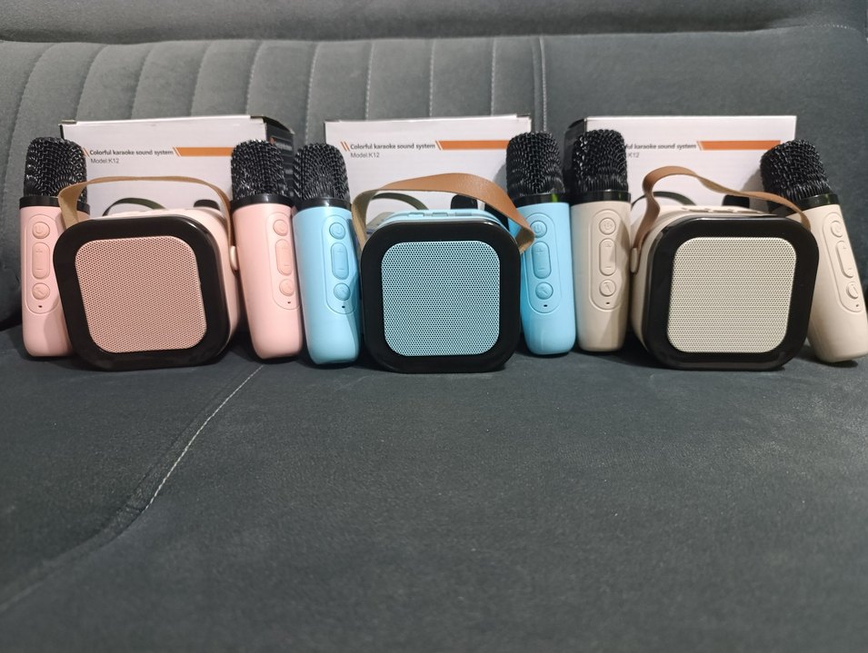 Çok renkli Bluetooth hoparlör seti, kablosuz mikrofonlarla birlikte, karaoke ve taşınabilir kullanım için uygun.