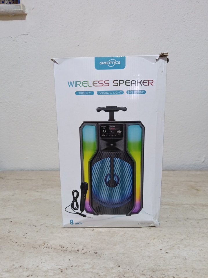 8 inç sürücüye, gökkuşağı LED ışıklara ve taşıma koluna sahip renkli kablosuz Bluetooth hoparlör. Mikrofon ve USB bağlantısı içerir.
