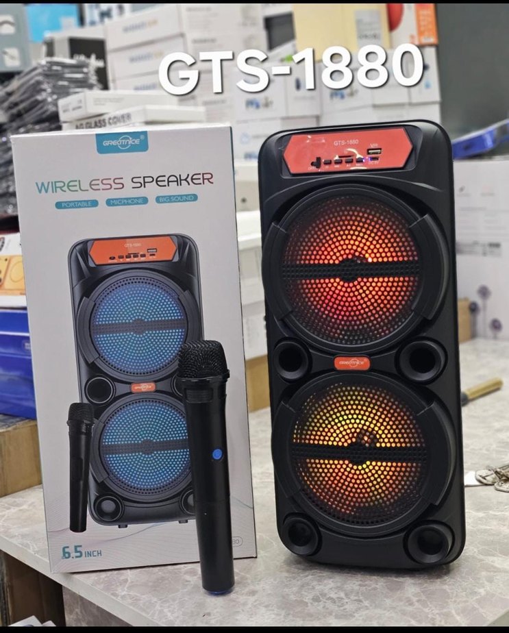 GTS-1880 kablosuz hoparlör, renkli LED ışıklar, Bluetooth bağlantısı ve mikrofon ile birlikte gelir. 6,5 inç hoparlörler ve çoklu ses kaynaklarını destekler.