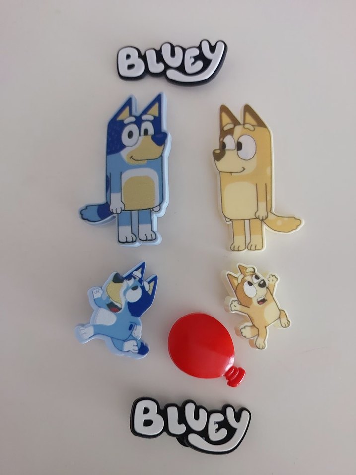 Fransadan alındı. takım olarak satışta. Renkli Bluey figür seti, mavi ve sarı tonlarda karakterler ve kırmızı balon içerir.
