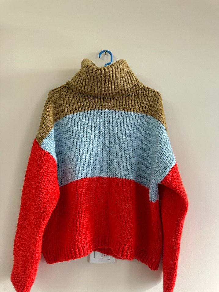 Kadınlar için bu kazak, boğazlı ve uzun kollu örgü tasarıma sahiptir. Renkli blok desenli, bol kesimdir ve günlük rahat kullanıma uygundur.