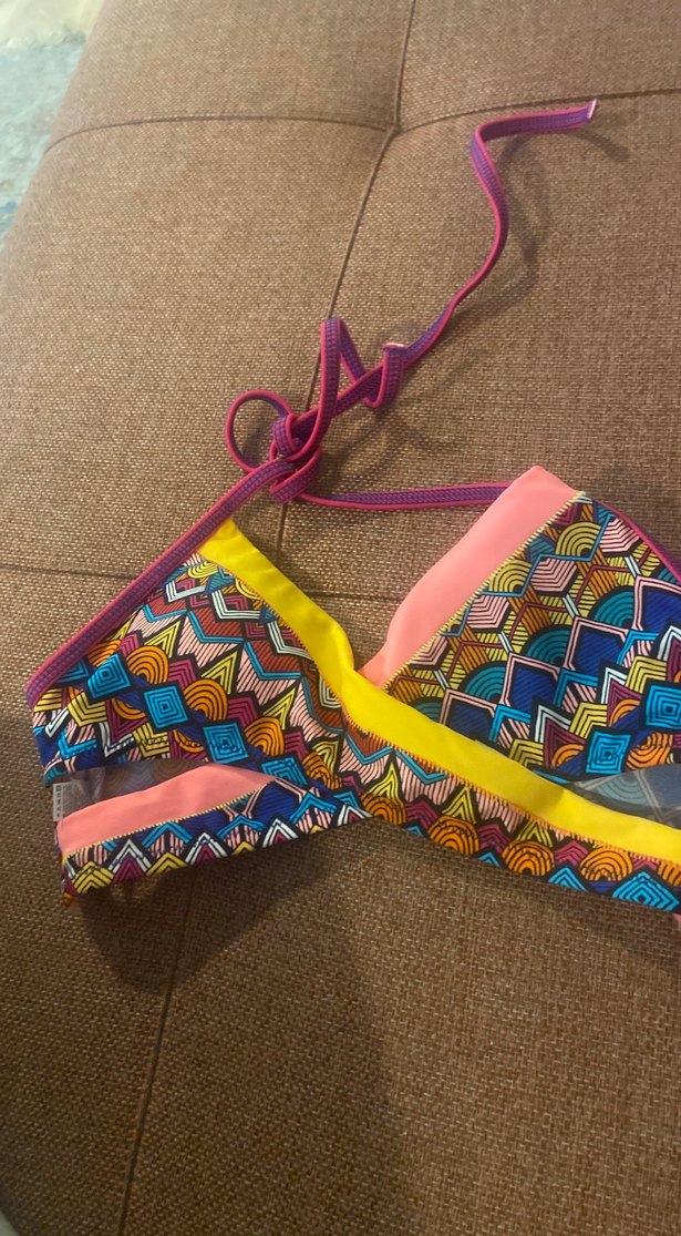 Renkli bohem bağcıklı bikini üstü, fermuarlı detaylı, bağlamalı askılı ve tie-dye desenli, kısa ve vücuda oturan model.