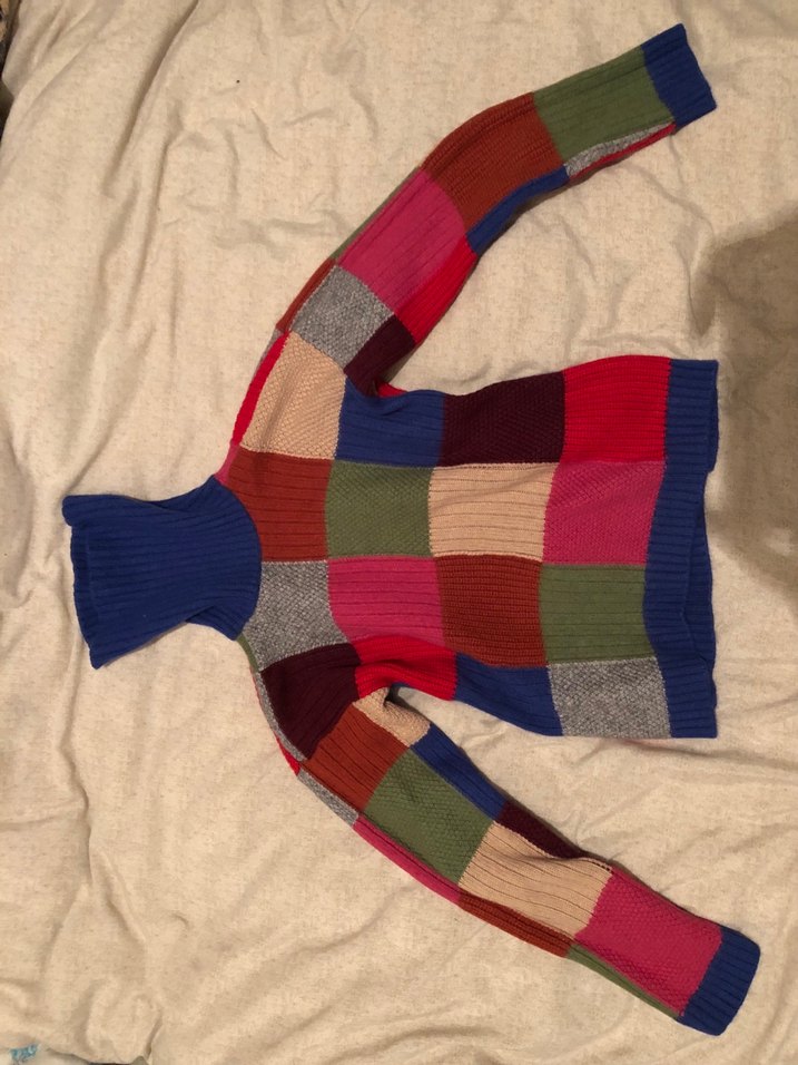 Balıkçı yaka ve uzun kollu, renkli patchwork desenli, triko kumaştan yapılmış bohem tarzda dar kesim kadın kazak. Rahat ve günlük kullanım için uygun.