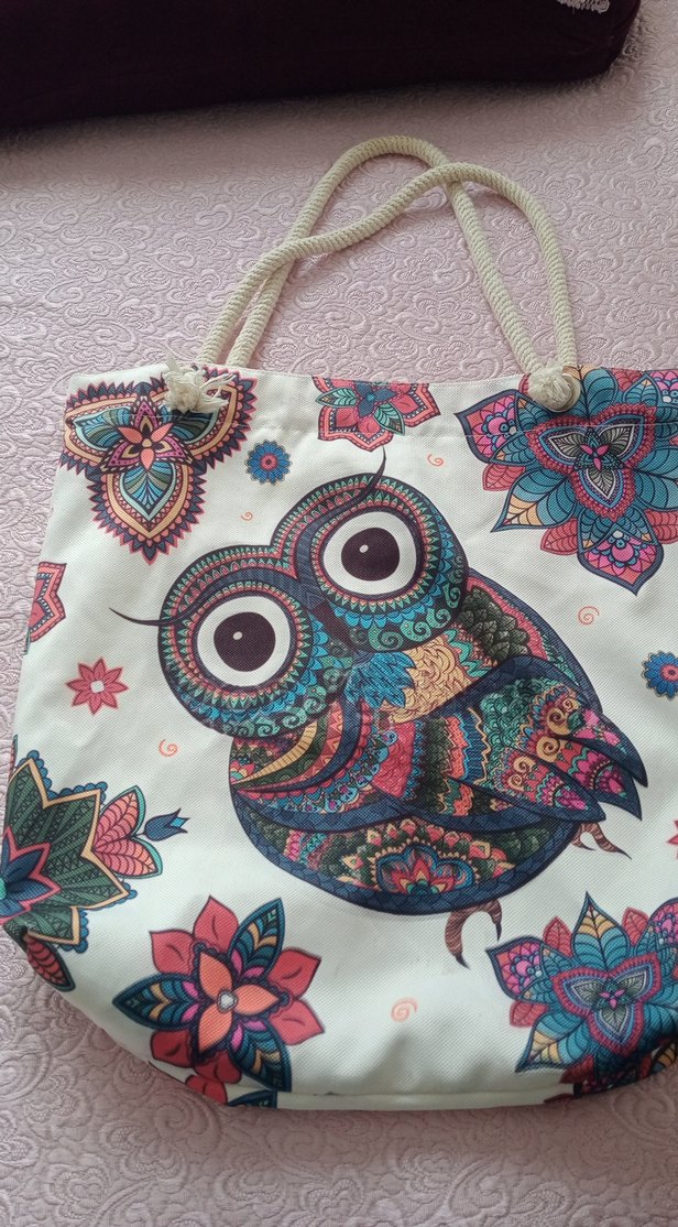 Renkli bohem tarzda, baykuş ve çiçek desenli plaj çantası. Püskül ve ip saplı, sentetik kumaştan yapılmıştır. Günlük kullanım için uygundur.