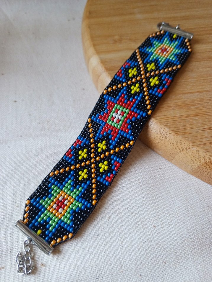 Renkli boncuklardan oluşan, kültürel, desenli Selçuklu motifli kadın bileklik, günlük kullanım için uygundur. Ayarlanabilir zincir kullanılmıştır.
