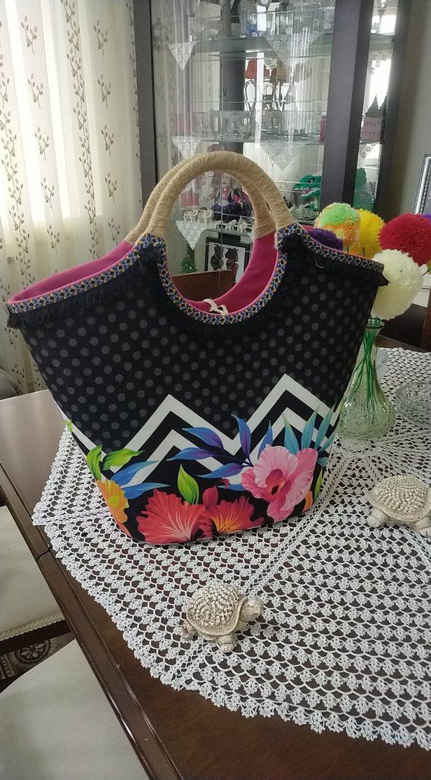 Renkli baskılı tekstil malzemeden üretilmiş, dantel detaylı ve sağlam ip saplı bohem tarzda kadın çantası.