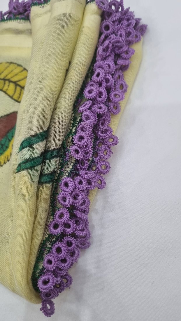 Kadın fular, renkli tekstil kumaş ve mor dantel kenar detayına sahip, bohem tarzı yansıtıyor. Bohem, hippie ve retro kombinlere uygundur.