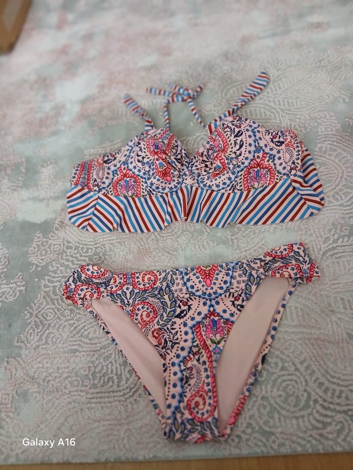 Renkli, bohem desenli ve dantelli bu bikini takımı, askılı üst ve kısa alt parçaya sahiptir. Plaj için uygundur.