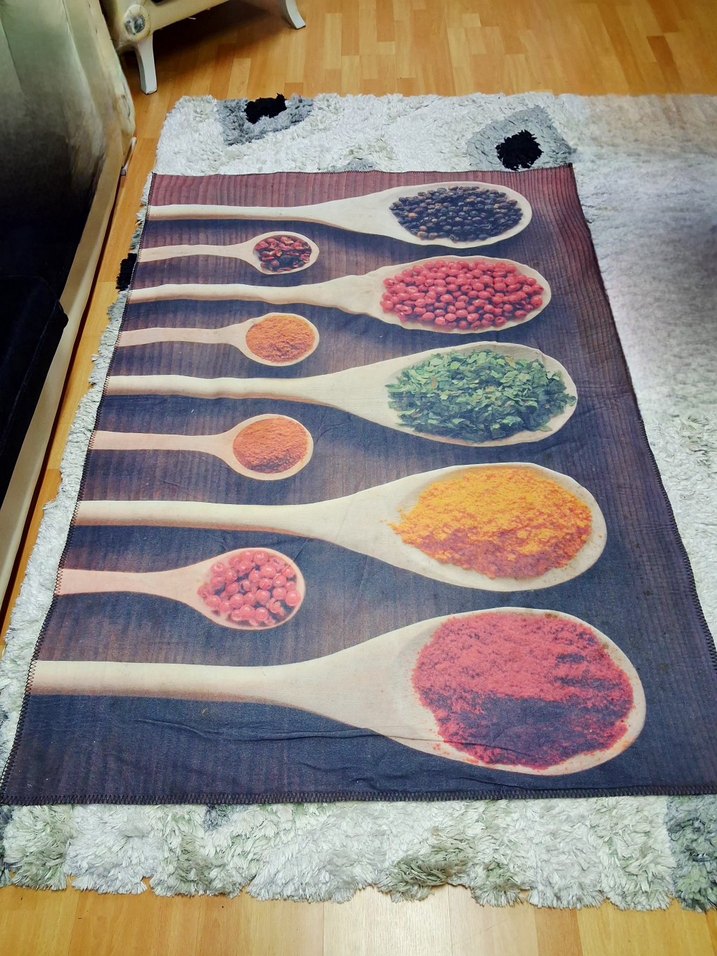 Koyu zemin üzerinde ahşap kaşıklarla renkli baharatların baskılı deseni olan bohem tarzda halı. Her mutfağa canlılık katar. boy 1.82 cm en resimde var