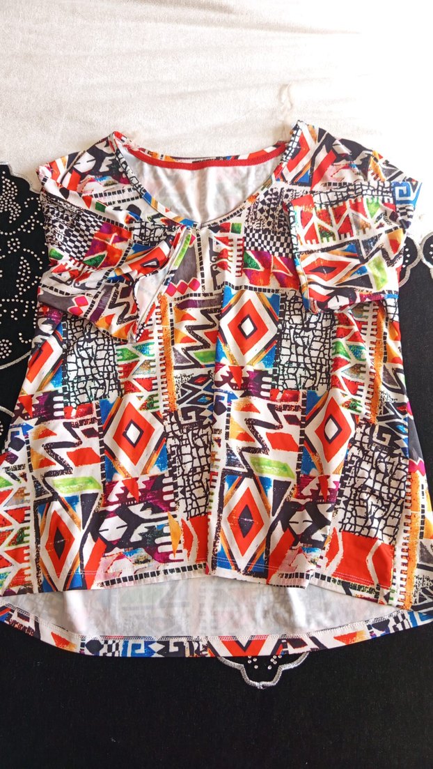 Renkli geometrik desenlere sahip, pile detaylı, V yakalı, kısa kollu bol kesim bohem tarzı bluz.