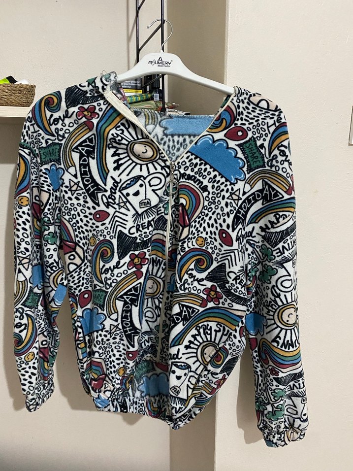 Uzun kollu, yuvarlak yakalı, düğmeli ve bol kesim kısa hirka. Canlı renkli baskılı kumaştan, günlük sokak stili için uygun.