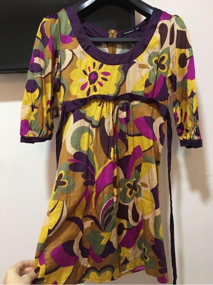 Renkli, bol kesim elbise. Canlı batik desenli, günlük kullanıma uygun. Sorunsuzdur.