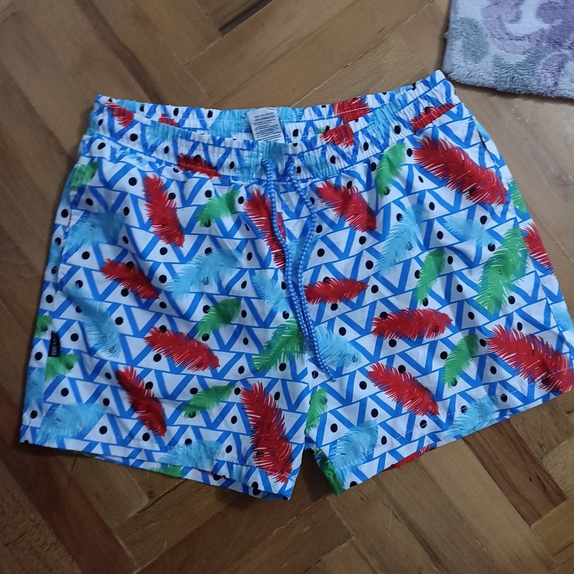 Renkli tie-dye desenli, pilili, bol kesim erkek mini şort, plaj ve gündelik kullanım için uygun.