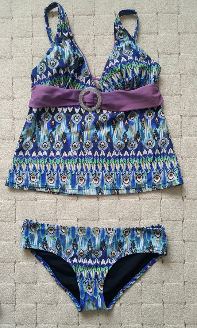 Renkli tie-dye desenli, askılı ve volan detaylı, vücuda oturan iki parçalı mayo. Plaj için uygundur.