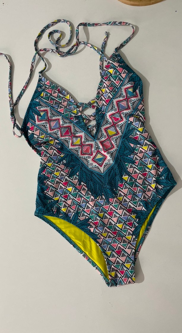 Renkli bohem desenli, askılı ve fermuarlı önden kapamalı, normal boyda kadın mayo. Plaj için uygun ve vücuda oturan kesime sahip.