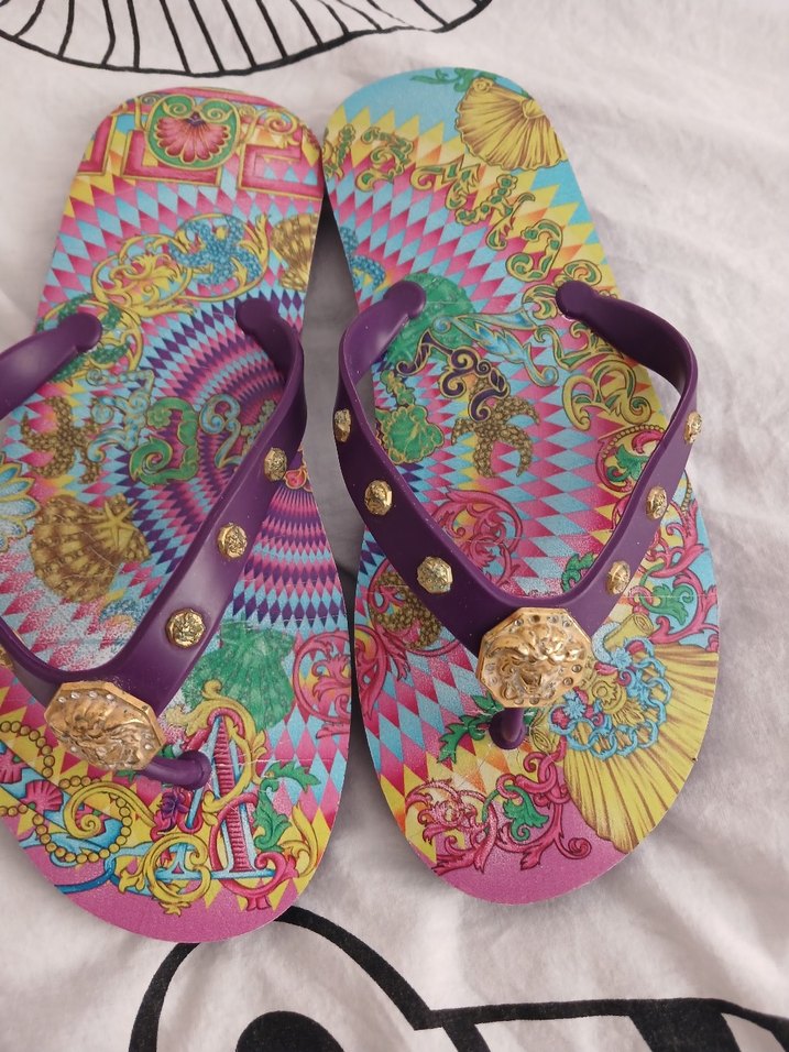 Renkli desenli, tokalı bantlı ve dolgu topuklu kadın terlikleri, plaj için uygundur. Dayanıklı kauçuk malzemeden üretilmiştir.