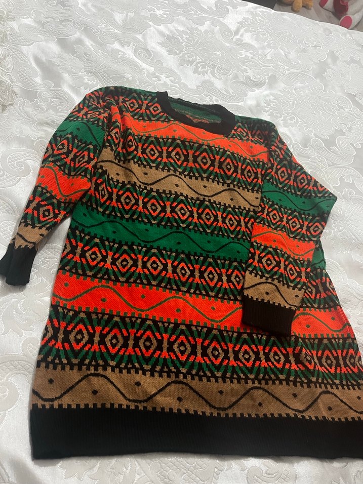 Renkli bohem desenli, uzun kollu, bol kesim ve yuvarlak yaka kadın kazak. Örgü kumaştan retro ve rahat bir tarz sunar.