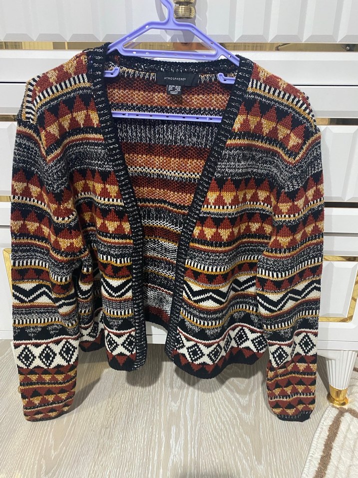 Örgü kumaştan, bol kesim, uzun kollu ve kayık yaka kısa hırka. Koyu renkli çoklu bohem desenlere sahip, günlük kullanıma uygun.