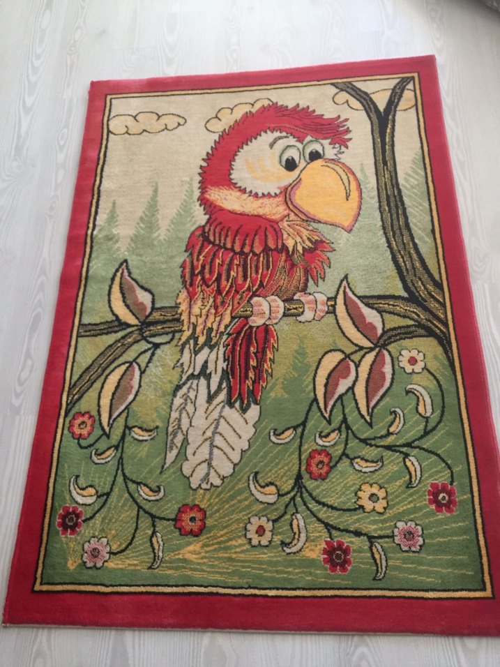 Kırmızı çerçeveli, çiçekli dallar üzerinde kuş baskılı renkli bohem desenli halı. Canlı ve sanatsal deseniyle mekana karakter katıyor.