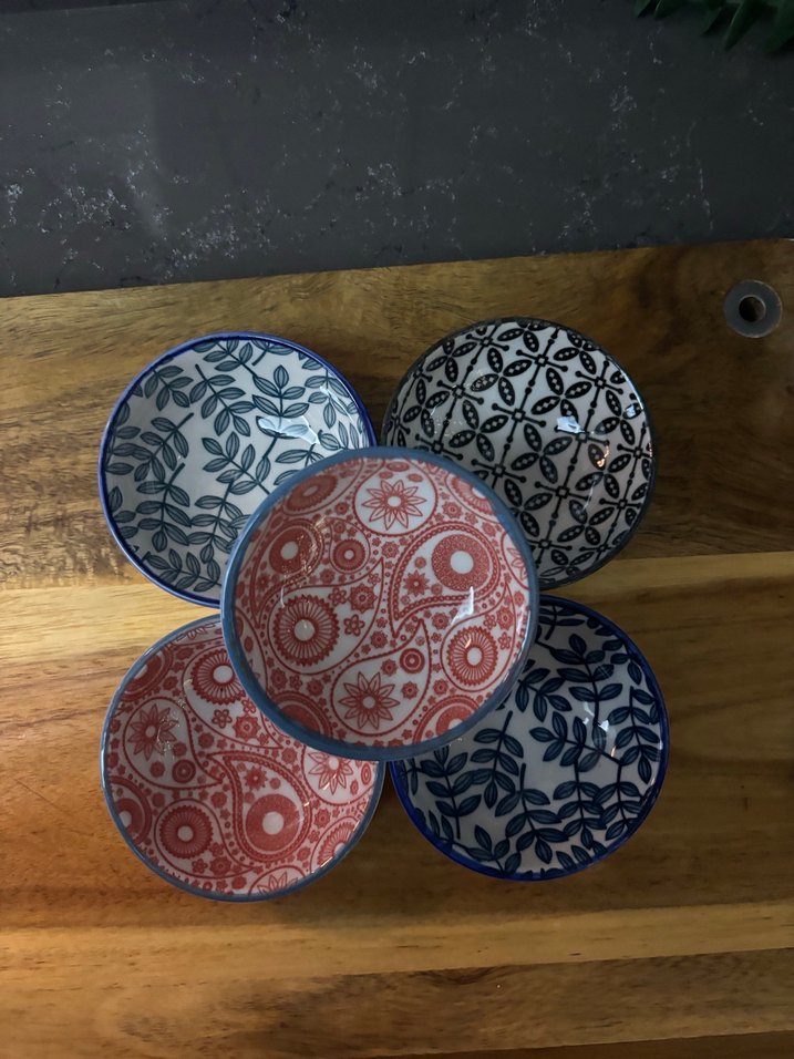 Canlı bohem tarzda, çok renkli desenlere sahip beş parçalı tabak seti, sofranıza hareket katar. ️