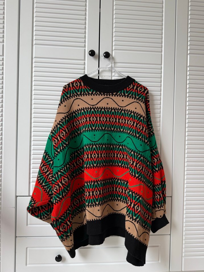 Renkli desenlere sahip, bol kesim ve uzun kollu örgü kadın kazak. Bohem tarzda, normal midi boyunda ve günlük kullanıma uygun.