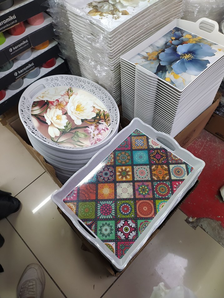 Renkli ve çeşitli bohem desenlere sahip servis tepsileri. Her tepsi canlı çiçek ve geometrik desenler içerir.