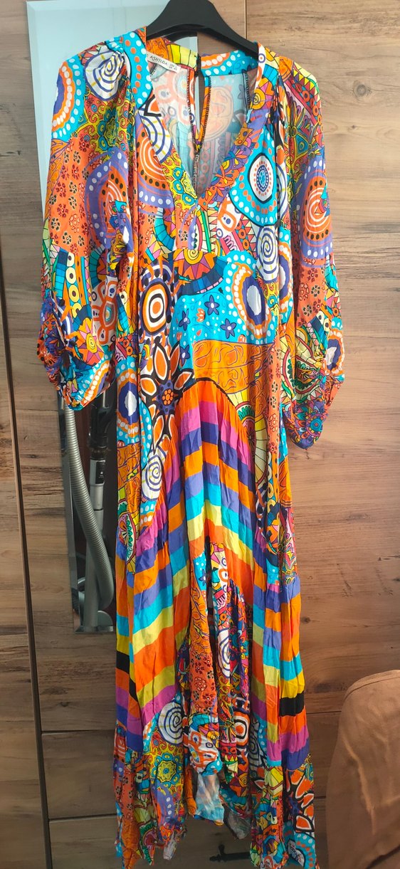 Renkli, bohem desenli uzun elbise, bol kesim, drapeli uzun kollu ve tekne yaka, yumuşak tekstil kumaştan yapılmıştır.