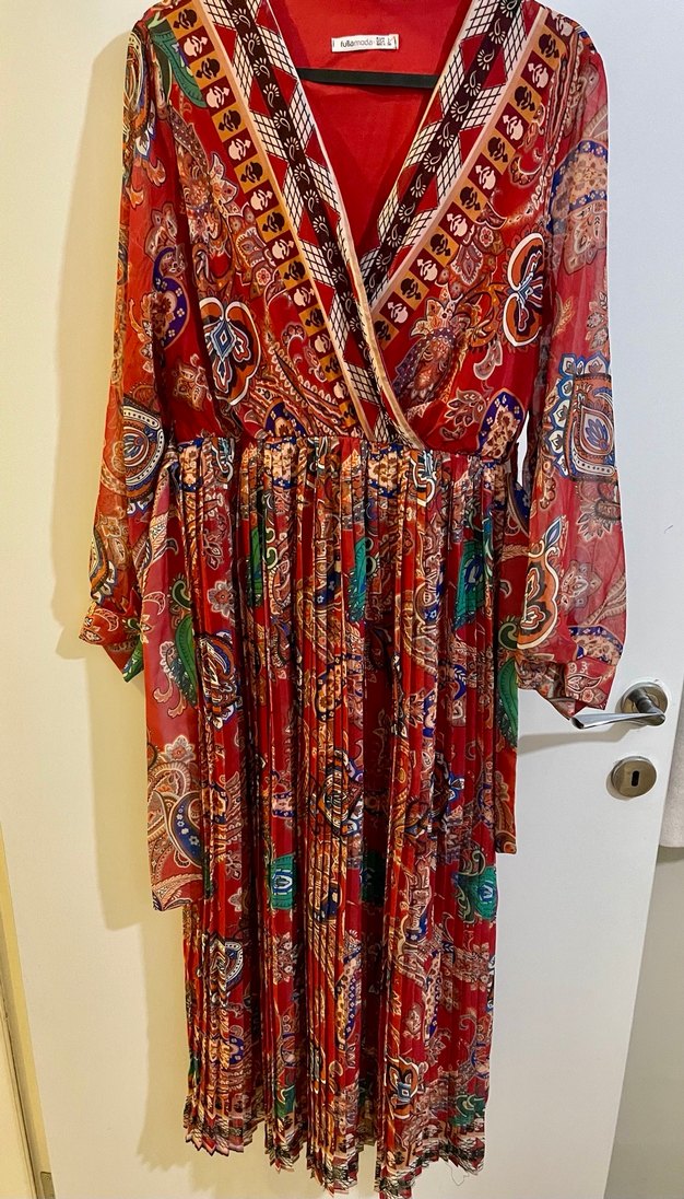 Renkli bohem desenli uzun elbise, pileli etek ve V yaka, askılı kollu tasarıma sahip, rahat kesim ve tekstil kumaştan. Parti için uygun.