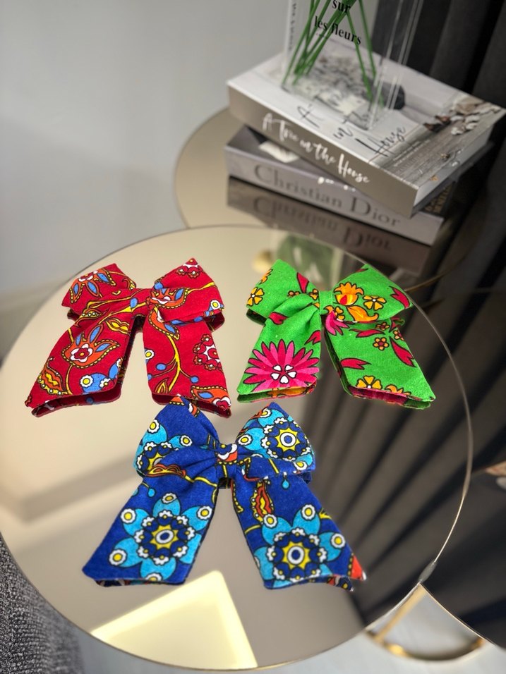 Canlı bohem desenlere sahip renkli tekstil saç tokaları, görünümünüze pop kültür dokunuşu katmak için ideal.